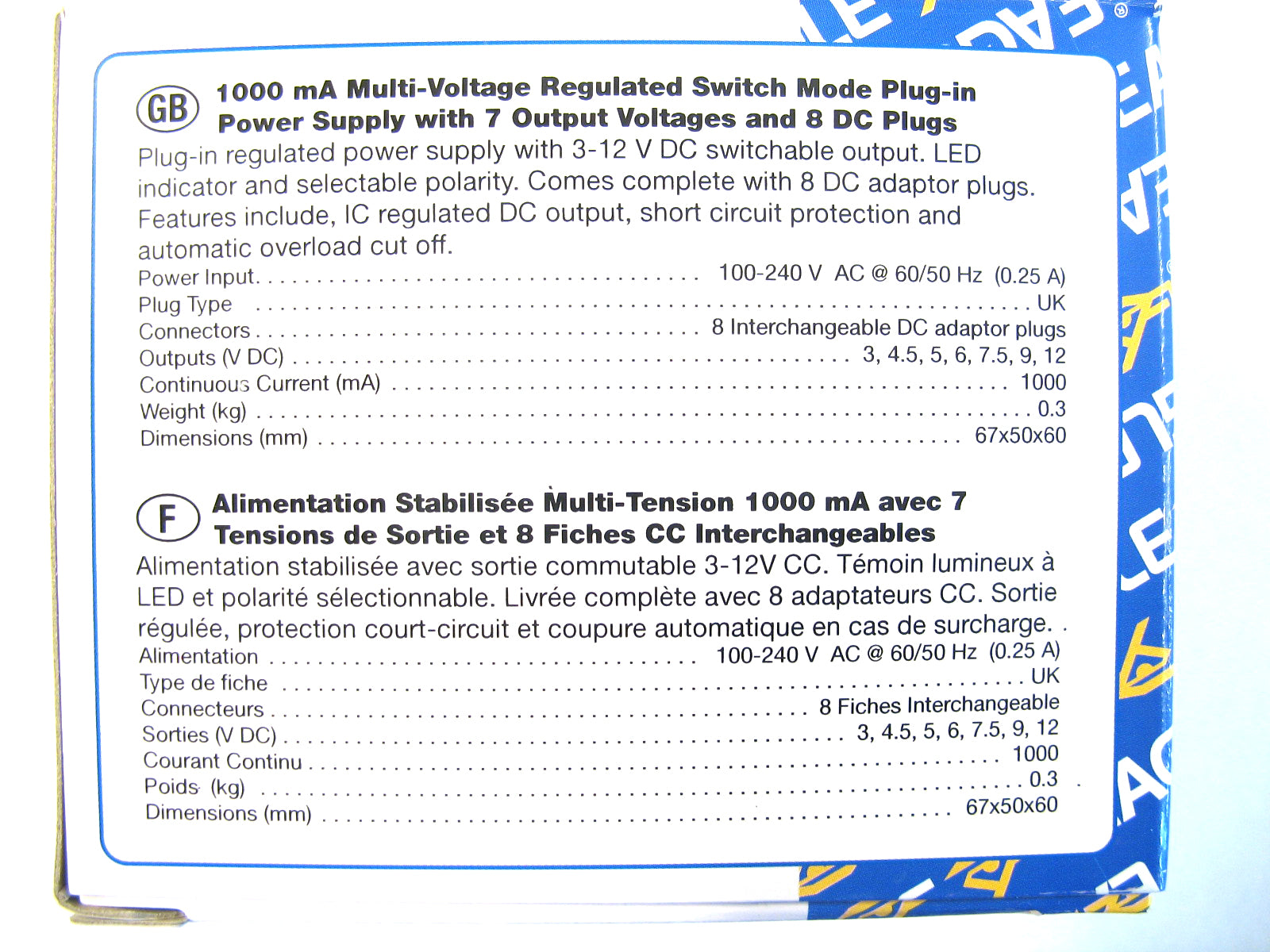 A 1 amp 12 watt multi voltage AC/DC regulated switch mode power supply suitable for appliances requiring a DC input of 1000ma or lower, positive or negative centre polarity, along with any of the following voltages.